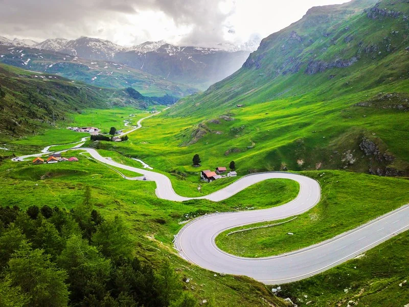 Il secondo giorno è pura essenza alpina: entreremo in Svizzera passando dalla spettacolare Cascata dell’Acquafraggia, per affrontare in sequenza alcuni dei passi più belli delle Alpi: